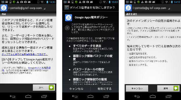 Google Apps のアカウントを利用するためには、端末ポリシーを使って一定のセキュリティ基準を満たす必要があります。