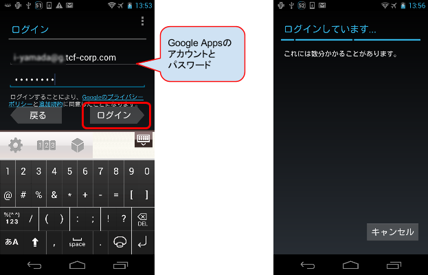 「メール」にはGoogle Apps のアカウント(メールアドレス)とパスワードを入力して「次へ」を押します。