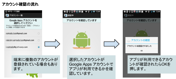 Android に設定されている Google アカウントの一覧から Google Apps アカウントを選択するとサーバーの確認が行われます。